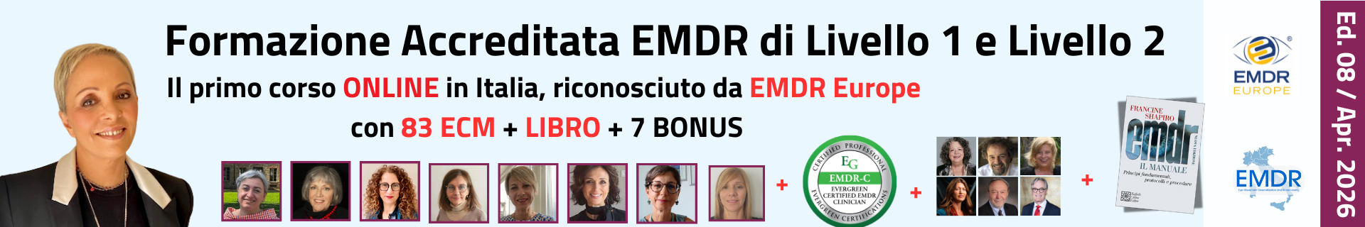 Iscrivendoti al training avrai 2 ulteriori BONUS in omaggio: l’invio del libro cartaceo “EMDR. Principi fondamentali, protocolli e procedure” di Francine Shapiro, edito da Raffaello Cortina, e 6 Corsi Ondemand (con Janina Fisher, Stephen Porges, Arielle Schwartz e altri docenti nazionali e internazionali) per un totale di 18 ore BONUS sul trauma