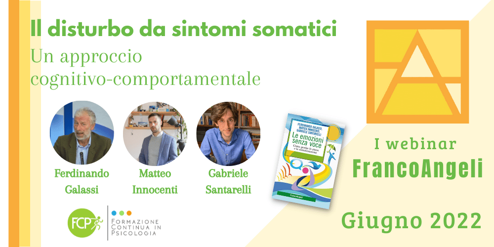 In questo webinar, che nasce dal testo Le emozioni senza voce, edito da Franco Angeli, verranno affrontate le principali tecniche cognitivo-comportamentali che possono essere applicate nel trattamento del disturbo da sintomi somatici e verrà mostrato come condurre il paziente, inizialmente concentrato sul proprio corpo, percepito come sofferente e malato, a gettare nuovamente il proprio sguardo sul mondo, recuperando le proprie fonti di piacere, di interesse e di soddisfazione.